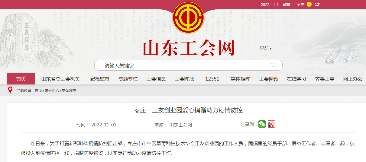 10月29日,棗莊市市中區(qū)草莓種植技術(shù)協(xié)會(huì)工友創(chuàng)業(yè)園號(hào)召會(huì)員單位,為當(dāng)?shù)貞?zhàn)“疫”貢獻(xiàn)力量。滿滿兩車的方便面、面包、八寶粥等愛心物資,向奮戰(zhàn)在疫情防控一線的工作人員表達(dá)了關(guān)心和問候。